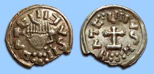 Beschrijving van een opmerkelijke vondst van een Madelinusmunt uit de zevende eeuw, gevonden in Maartensdijk. Deze gouden munt is een unieke variant. Op de voorzijde staat niet de plaatsnaam, maar een herhaling van het verbasterde MADELINVS M van de keerzijde. |